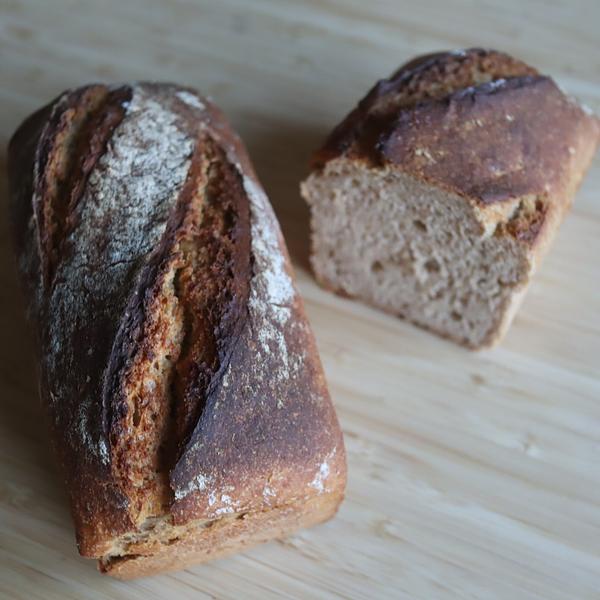 Fermentowany ponad 24h i wyrastający w chłodzie chleb pszenny w formie bochenka, na żytnim zakwasie. Stosunek mąk: 85% pszenna, 15% żytnia. Skład: Mąka pszenna typ 750*, woda, zakwas (mąka żytnia typ 2000*, woda), sól. Masa netto 650g. * - alergeny